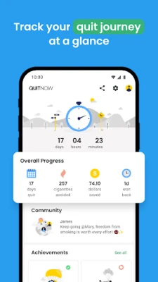 Et hoida motivatsiooni kõrgel, pakub QuitNow üle 80 verstaposti, mis tähistavad teie saavutusi vältitud sigarettide, suitsuvabade päevade ja säästetud raha põhjal. Need väikesed võidud aitavad teil märgata edusamme juba esimesest päevast. Lisaks jälgib QuitNow teie tervise taastumist Maailma Terviseorganisatsiooni andmete põhjal, näidates, kuidas teie keha päev-päevalt paraneb. Küsimuste korral on QuitNow AI valmis pakkuma usaldusväärset ja kiiret teavet, tuginedes meie kursusele ja WHO andmetele. Avastage ka hoolikalt valitud raamatute kogu, mis pakub täiendavaid strateegiaid ja inspiratsiooni. Ja neile, kes soovivad oma edusamme jälgida ka randmelt, pakub QuitNow Wear OS rakendus mugava lahenduse. Me usume, et QuitNow on teie parim partner teekonnal tubakavaba ja tervema tuleviku poole.